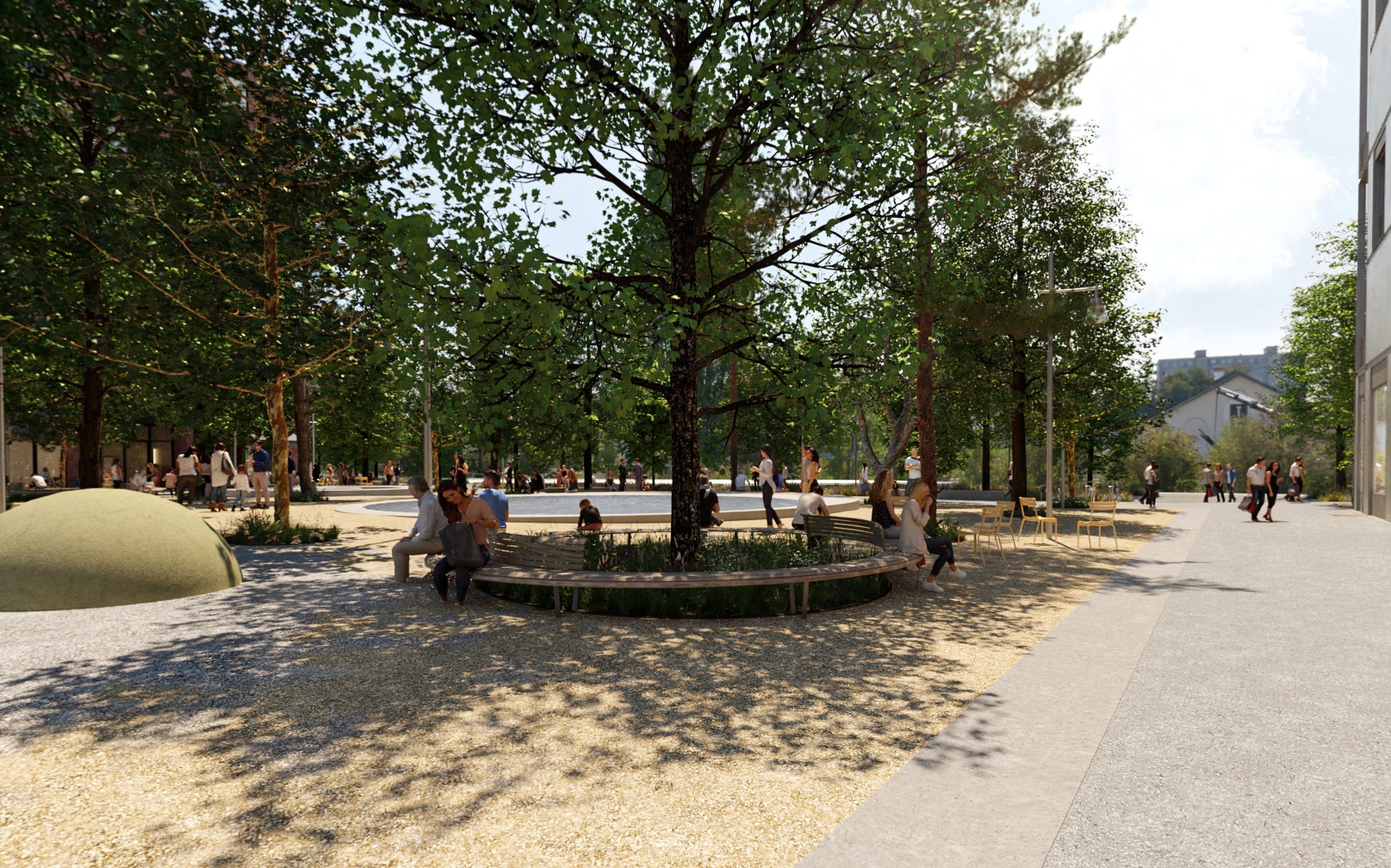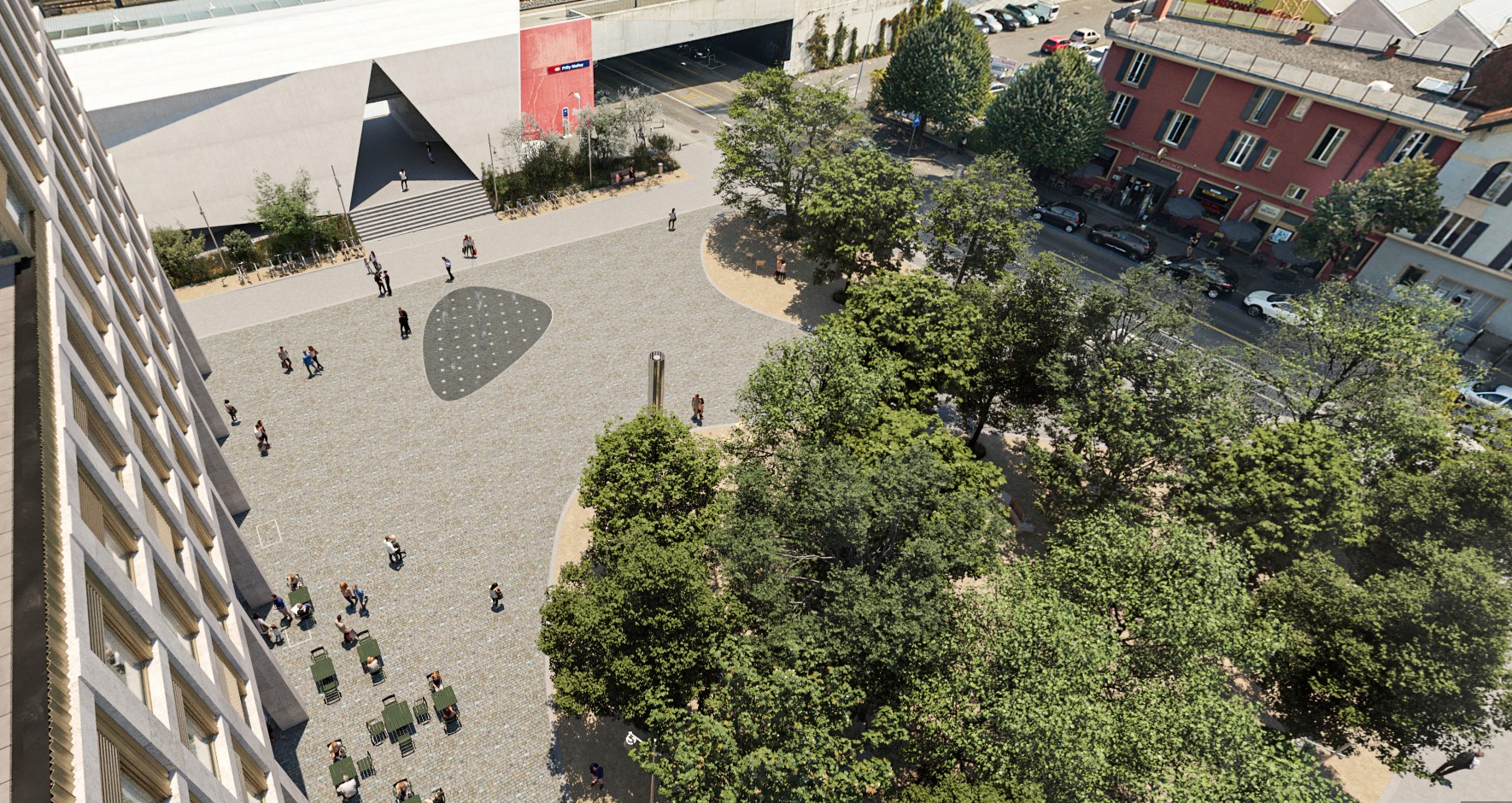 A la sortie du Trait d’union, la place de Malley offrira des moments de dente et d’amusement grâce à son arborisation généreuse, son bassin d’eau et sa place de jeux pour enfants.